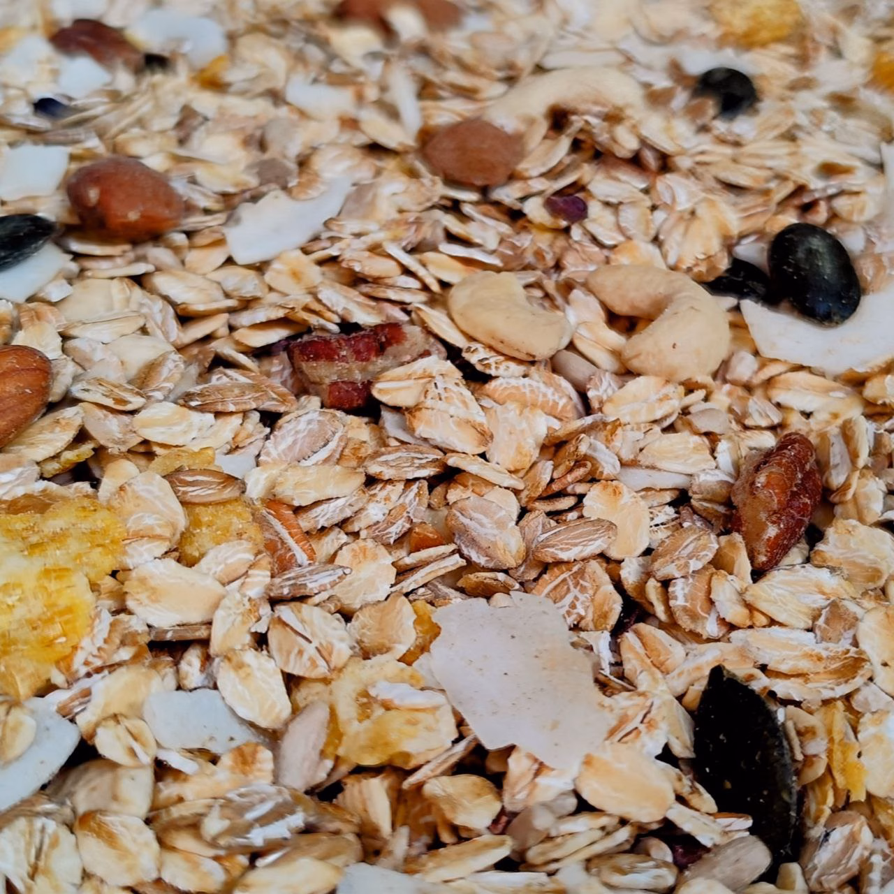Haferflocken*, Roggenflocken*, Sonnenblumenkerne*, Kokoschips geröstet*, Buchweizen geröstet*, Haselnusskerne gehackt geröstet*, Kürbiskerne*, Cashewkerne*, Maisflakes*, Kakaobohnenstücke*, Mandeln braun*, Pekannusskerne*