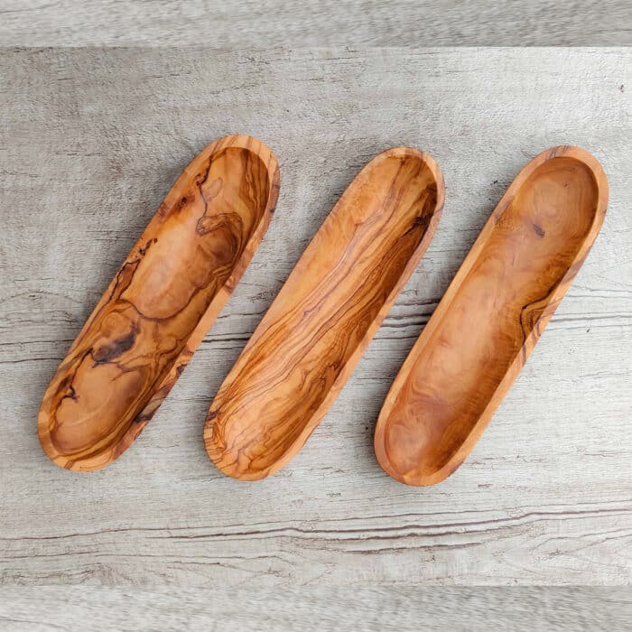 Bol rustique en bois d’olivier d’environ 30 cm de long, fabriqué à partir d’un morceau de bois d’olivier italien fin – un régal pour les yeux. Pour tous ceux qui préfèrent une version plus longue de nos petits bols à olives rustiques .